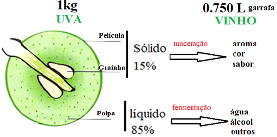 Vejamos, com detalhe, a constituição ponderal dum bago de uva. Ele contém 15% de parte predominantemente sólida que integra as grainhas e a película. É aí que se encontram os compostos fenólicos e desde logo as antocianinas que conferem a cor ao vinho e que provêm das películas. Também se encontram aí em grande medida os restantes polifenólicos que originam o aroma e o sabor do vinho. Por sua vez temos 85% de parte líquida proveniente da polpa, rica em açúcar, contendo também minerais e ácidos. No caso das uvas tintureiras, tais como Alicante Bouschet e Vinhão, a polpa também é corada e por isso contém antocianinas.